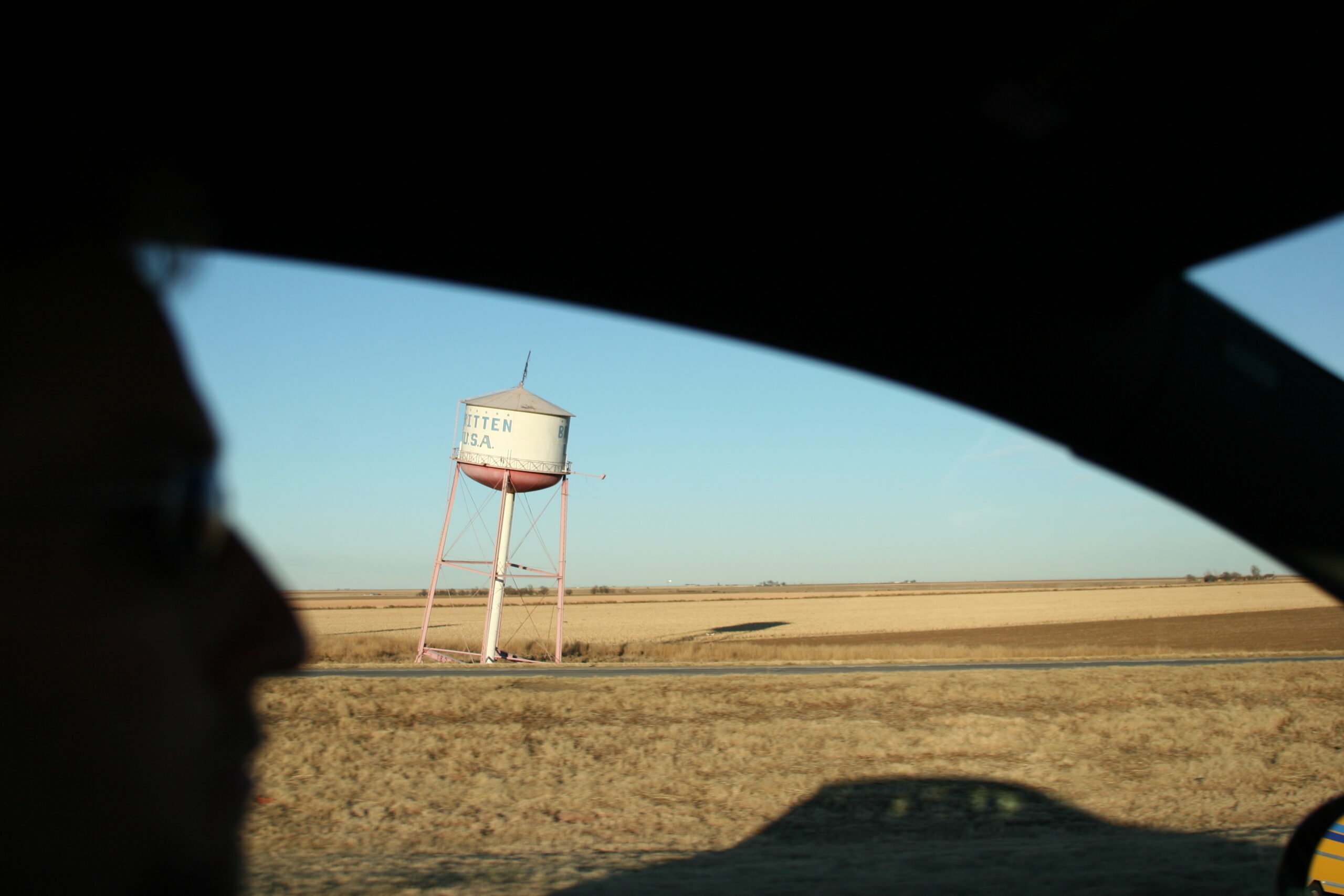 Shortly after passing the cross, we drove past a very random, leaning water tower. I’m not sure why it’s leaning or if it even holds any water, but it was a roadside amusement, so I took a picture. You can also see Mike’s profile in the shot.